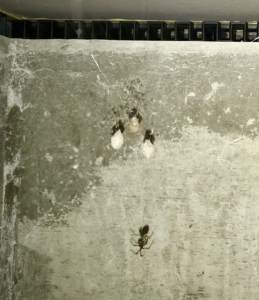 結果的にはクモしかおらず。こんなとこで糸張ってても餌とれなそうだけど、この3つの塊は餌ですか?