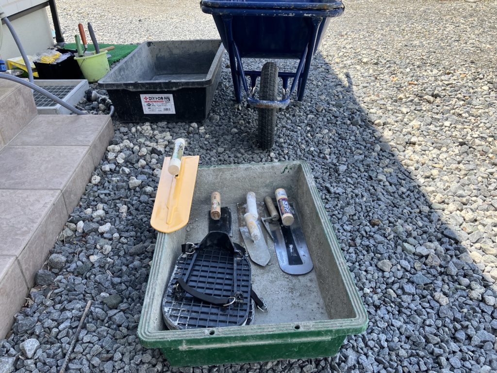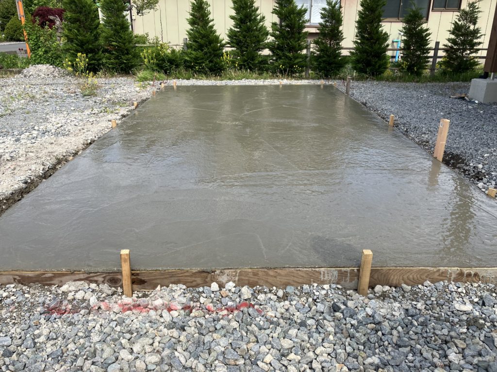 ミキサー車からダイレクトに生コン落とし入れてもらったのでスコップとアルミスクリードで平に慣らすことができました。作業員はファミリー4人がかりです。